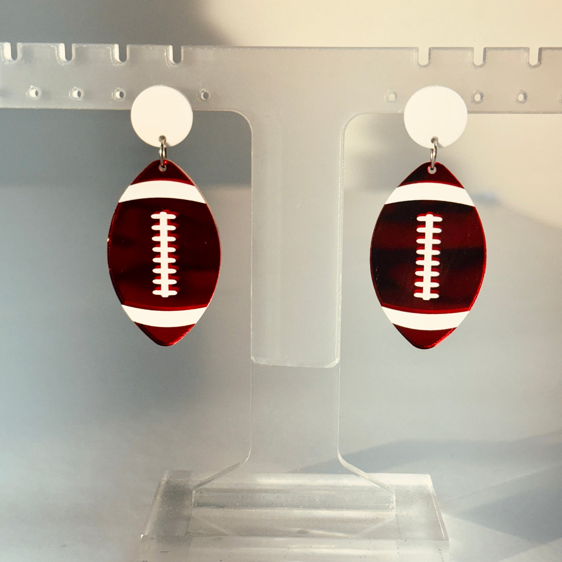 Show your team spirit in style with these bold Football Mirror Dangle Earrings! Crafted from lightweight red mirror acrylic and printed with realistic thread detailing, these earrings deliver a fun, eye-catching shimmer perfect for game day. Stainless steel settings make them hypoallergenic, lead-free, and nickel-free — comfortable enough for all-day wear.