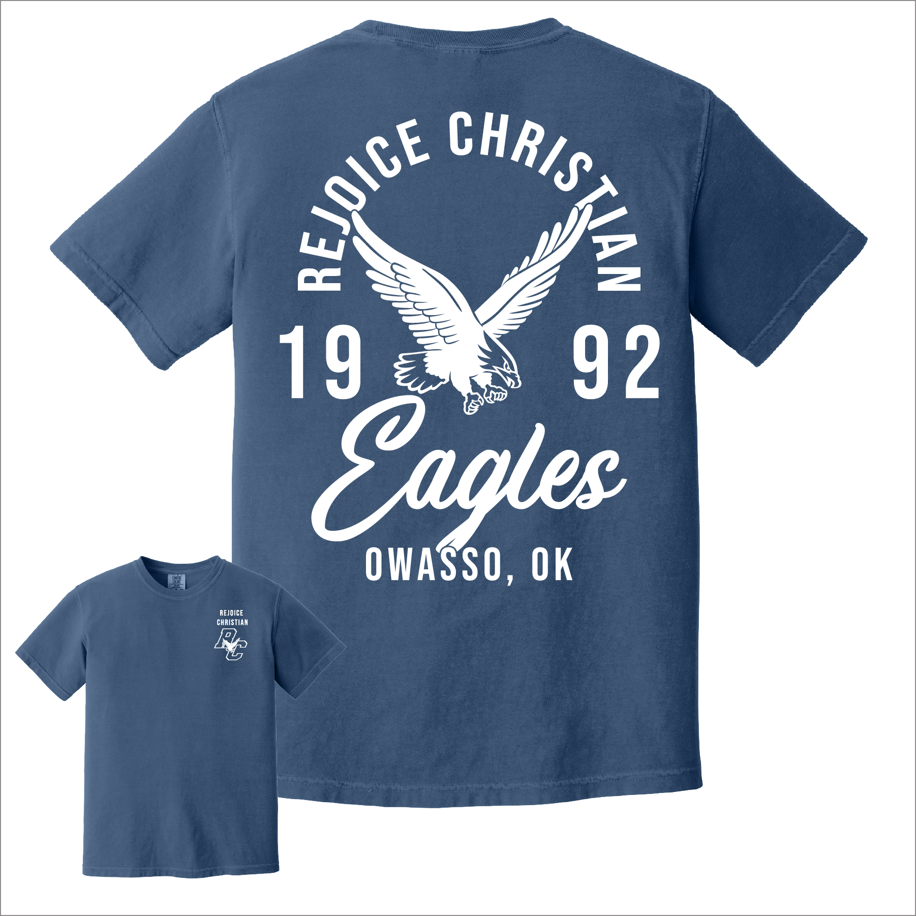 Celebrate Rejoice Christian tradition with the Rejoice Eagles Comfort Colors Tee, featuring the screen-printed Rejoice Legacy design. This heritage-inspired graphic highlights the soaring Eagle mascot, the year the school was established, and classic typography for a timeless look.